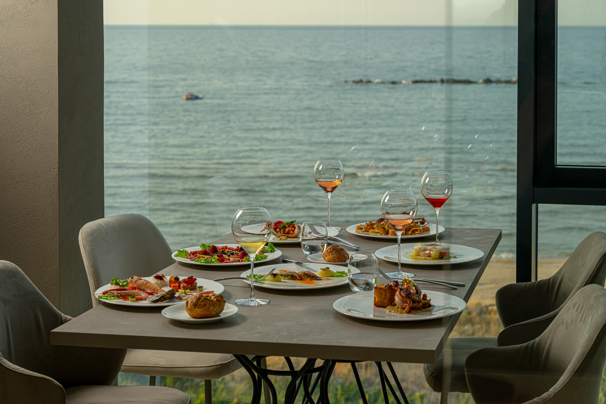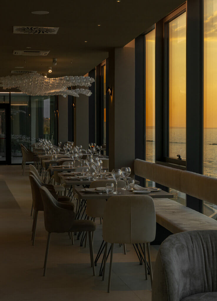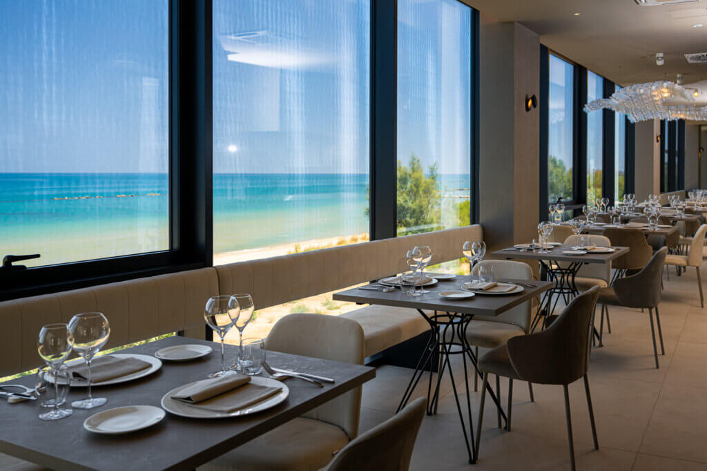 Il nostro ristorante si affaccia direttamente sul mare, regalando agli ospiti una vista unica che accompagna ogni momento del pasto. Le ampie vetrate panoramiche lasciano entrare la luce e il colore del cielo, creando un legame costante con l’orizzonte. Di giorno la sala è baciata dal sole, di sera si accende di riflessi dorati, mentre al tramonto si trasforma in uno spettacolo romantico e indimenticabile.