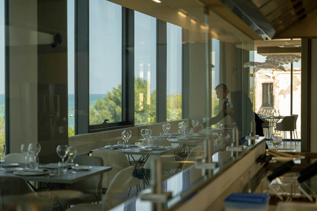 Dal vetro che riflette il mare al profumo di salsedine che entra dolcemente, dai colori caldi dell’arredamento alla musica di sottofondo, tutto è pensato per armonizzarsi con il paesaggio.
