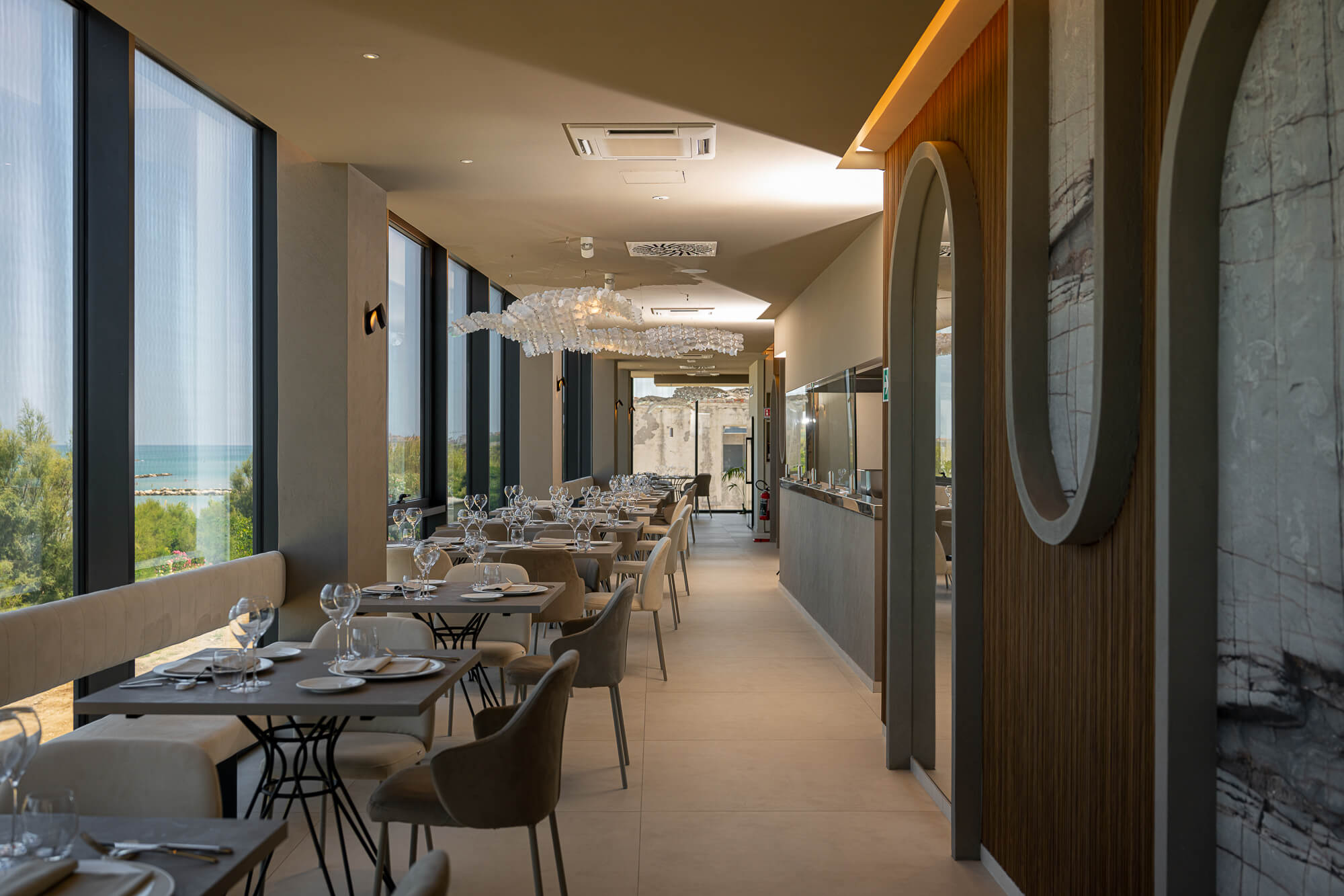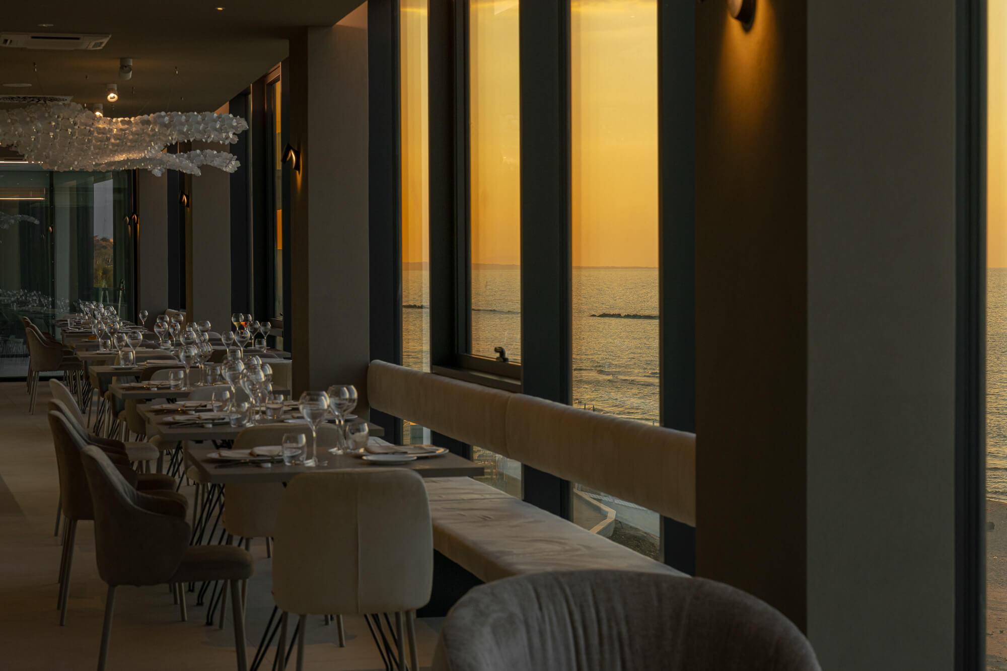 Il nostro ristorante si affaccia direttamente sul mare, regalando agli ospiti una vista unica che accompagna ogni momento del pasto. Le ampie vetrate panoramiche lasciano entrare la luce e il colore del cielo, creando un legame costante con l’orizzonte. Di giorno la sala è baciata dal sole, di sera si accende di riflessi dorati, mentre al tramonto si trasforma in uno spettacolo romantico e indimenticabile.